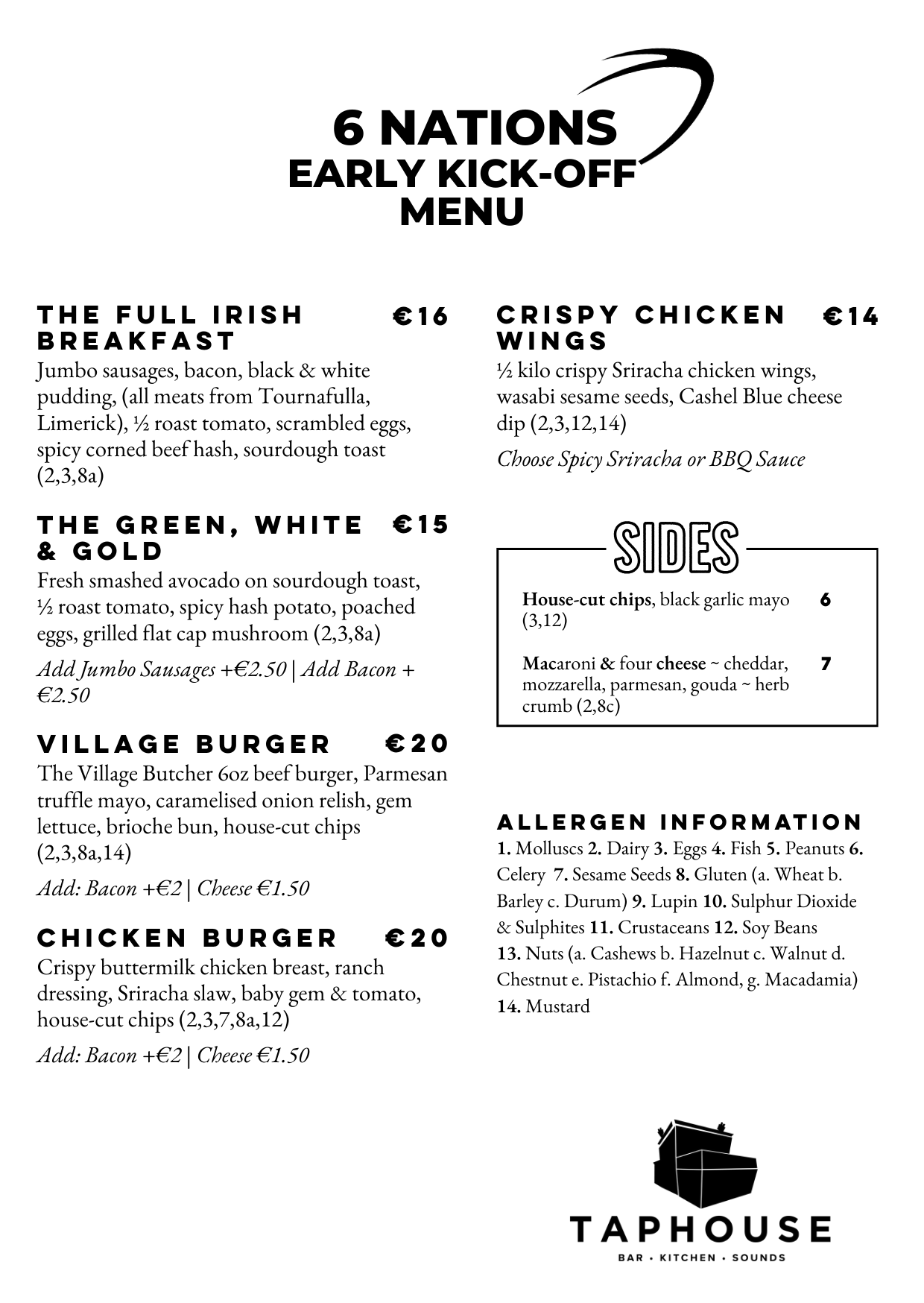 There’s nothing quite like watching a 6 Nations game in your local pub. We’re showing all the games plus we’re opening at 11:00am for the earlier Irish games on 14th February against Italy & 14th March against Scotland with some great breakfast specials like a Full Irish Breakfast or Smashed Avocado and Poached Eggs as well as a number of other Taphouse favourites.